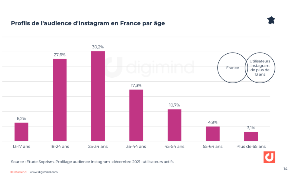 Attention, cela vous sera bénéfique si votre stratégie est clairement définie et si vos cibles sont belles et bien présentes sur la plateforme. Pour en être sûrs, vous pouvez commencer par observer la représentation graphique de l’âge des utilisateurs d’Instagram en France à fin 2021 réalisée par Digimind :